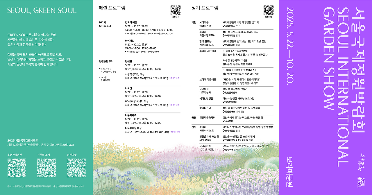 2025 서울국제정원박람회는 '정원 도시 서울'을 실현하기 위한 대표적인 행사로, 2025년 5월 22일부터 10월 20일까지 서울 보라매공원에서 개최됩니다. 올해로 10회를 맞이하는 이번 박람회는 'Seoul, Green Soul'이라는 서울의 역사와 문화 시민들의 삶 속에 스며든 자연이라는 주제로 진행되며, 다양한 정원 전시와 문화 프로그램을 통해 도시와 자연, 사람을 연결하는 정원의 가치를 조명합니다.